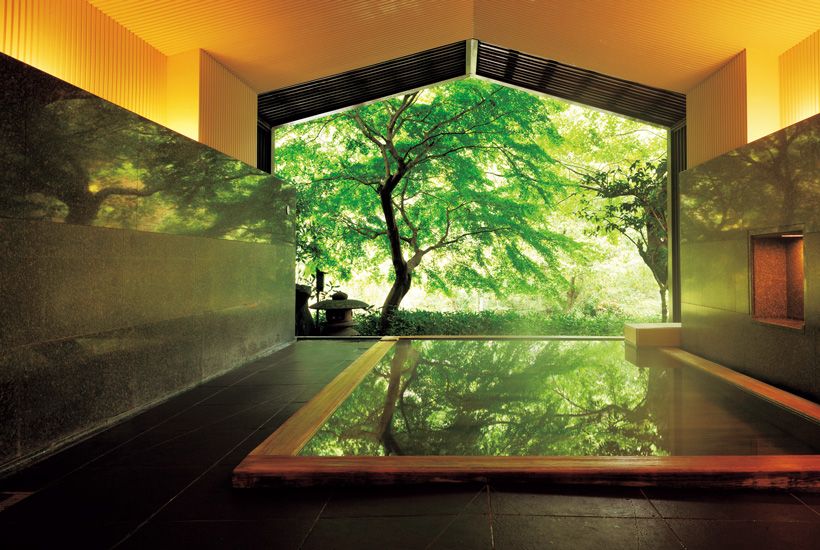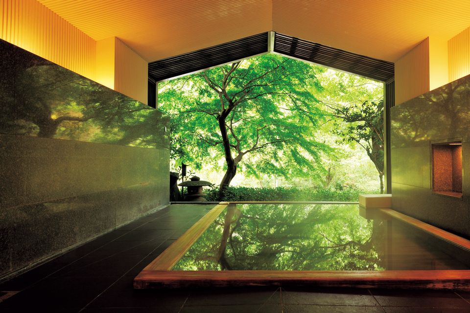 お楽しみは、一枚絵のような美しい景色が楽しめる半露天の大浴場(上写真)。冷え性などにもよいとされるナトリウム塩化物泉に浸りながら、湯坂山の四季折々の景色を堪能できます。