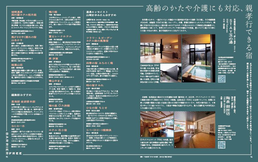 目的やシーンに応じた宿選びのヒントをきめ細かく提案するコラムも展開。各宿の紹介ページには公式サイトへ直接アクセスできる二次元コードも掲載しています。