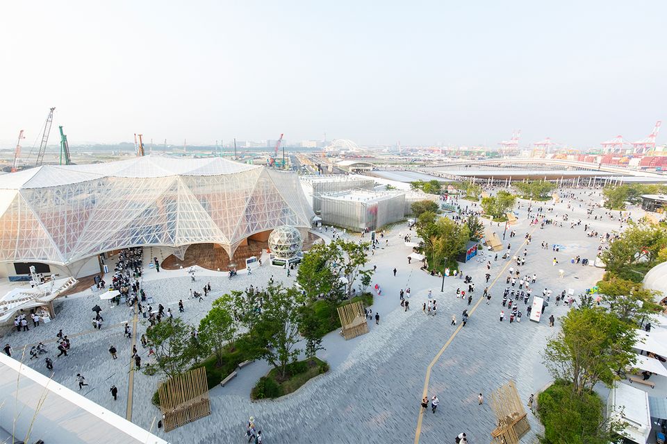 パビリオン内。約20メートルの吹き抜けで太陽光を取り入れられる透明の天井や、DNAのらせん構造から着想を得たヒノキの柱は圧巻。