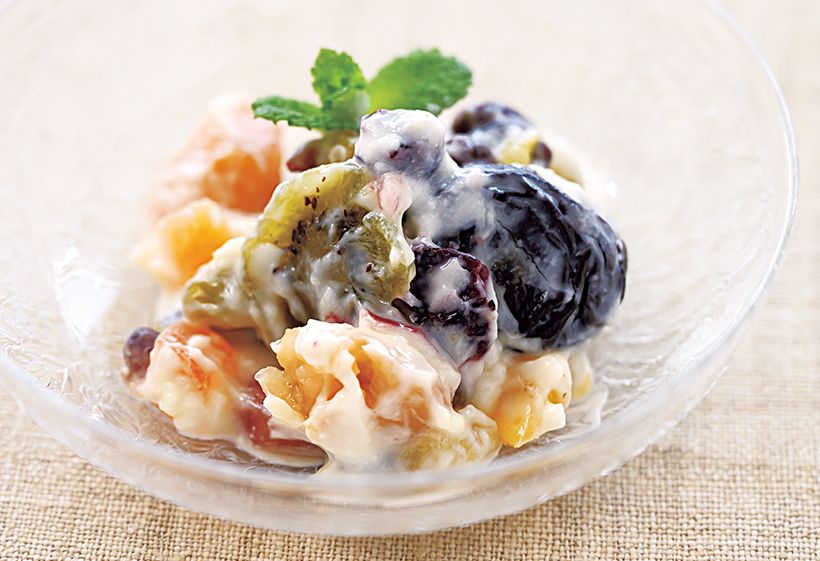 あずきや金時豆、白花豆などの甘納豆と、キウィフルーツやプルーンなどのドライフルーツを好みのヨーグルトで一晩マリネ。甘みは甘納豆やドライフルーツから引き出されます(量はお好みで調整)。発酵性食物繊維が酪酸菌を増やし、ヨーグルトで有用菌のビフィズス菌も増える腸内環境が整うデザートです。