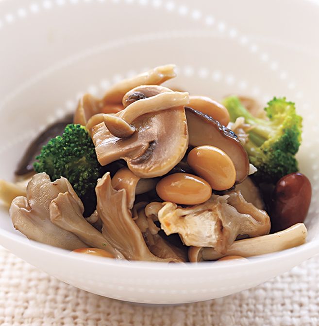 しいたけ、まいたけ、しめじ、マッシュルームを、みじん切りにしたにんにくとオリーブオイルで炒め、白ワインで煮た市販のミックスビーンズと混ぜ、塩で味をととのえます(量はお好みで調整)。発酵性食物繊維が豊富でパン食のおかずにも最適。全粒粉の食パンや小麦ブランシリアルを合わせれば、酪酸菌を育む朝食に。撮影/池田佳史(静物) 家庭画報本誌・大見謝星斗 料理・スタイリング/久保香奈子 編集・取材・文/鹿田真希