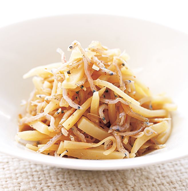 薄口醬油で煮たじゃこと、せん切りにしたじゃがいもとしょうがをきんぴら風に炒めます。一味唐辛子であえれば、ご飯がすすむ副菜に(量はお好みで調整)。冷凍した白米プラス雑穀・押麦のおにぎりをレンジで温めて一緒に食べれば、手軽な昼食に。酪酸菌がよりいっそう活性化します。