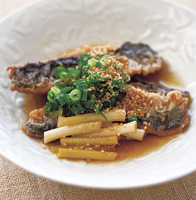 三枚におろしたいわしに全粒粉をまぶし唐揚げにして、すりごまがたっぷり入った甘酢に万能ねぎの根元と一緒に漬けます(量はお好みで調整)。いわしなどの青魚は不飽和脂肪酸(EPA・DHA)、ビタミンD、カルシウムが豊富で骨や血管、脳の健康増進に役立つので一日一食は魚料理を取り入れましょう。