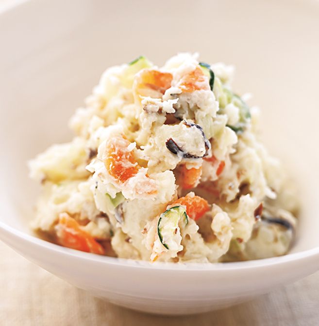 じゃがいもと里いもをゆでてマッシュし、塩もみしたきゅうり、玉ねぎ、にんじんを薄切りにし、オイルサーディンを加え、マヨネーズにヨーグルトを合わせてあえ、白こしょうと塩で味をととのえます(量はお好みで調整)。加工肉を避け、オイルサーディンを活用し、ヨーグルトを使った腸内環境が整う一品です。