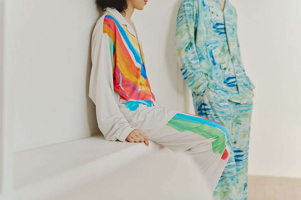 パジャマには、ヘラルボニーの契約作家である和田成亮さんの作品「ノースウエスト航空」と、同じく契約作家の笹山勝実さんの作品「無題」があしらわれています。