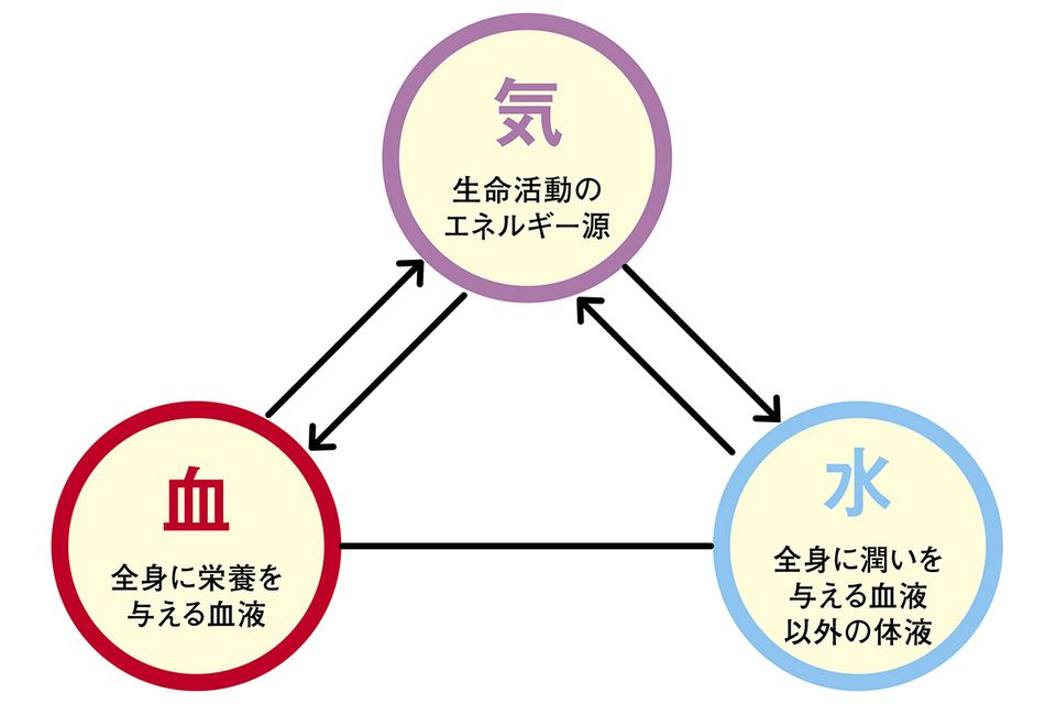 気・血・水のうち、最も重要なのは生命活動のエネルギー源であり、生命を維持する機能のすべてを担っている「気」です。気をベースに血と水が連動して働き、全身に栄養を届けたり、潤いを与えたりしています。この3つのバランスが保たれていることがとても重要で、それにより真の健康を得られるのです。