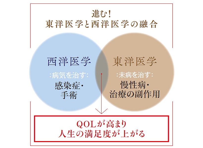 大野 羽田さんが体験されたように東洋医学にはQOL(生活の質)を高めてくれるよさもあり、看取りだけでなく、あらゆる場面での健康トラブルに対応可能です。国もこうした効果を期待し、西洋医学に東洋医学を組み合わせ、患者さんのQOL向上を目指す「統合医療」の方針を打ち出しています。厚生労働省は統合医療の情報発信サイト「eJIM」を構築し、エビデンスに基づいた情報を提供しており、私自身もこの事業に十数年かかわっています。