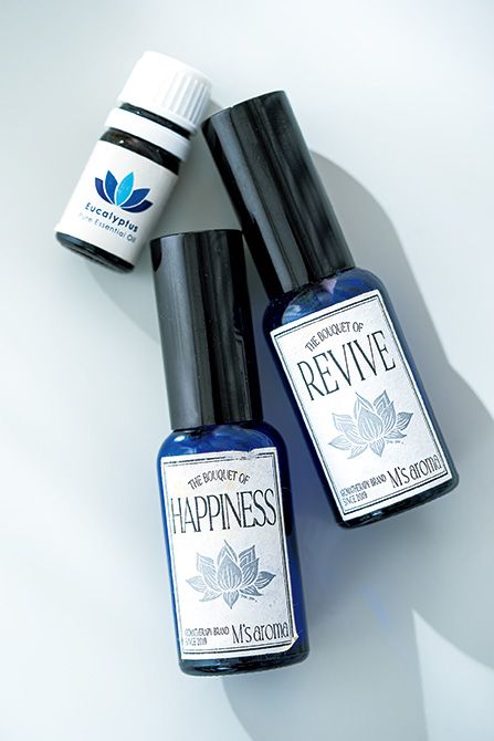 メンタルコントロールに効果があるオリジナルブレンドのアロマ精油は気分を上げたいときと落ち着きたいときで使い分ける。