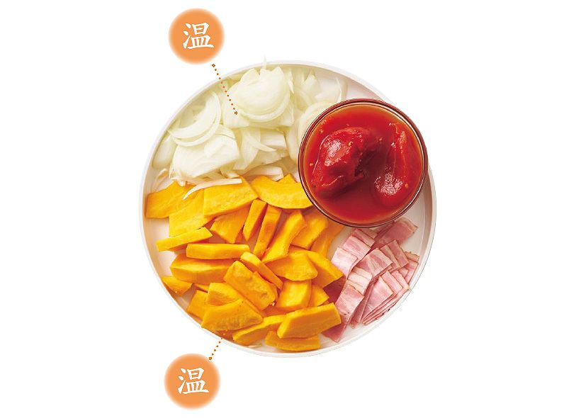 鍋にオリーブオイル小さじ2を中火で熱し、ベーコン、玉ねぎを炒める。玉ねぎがしんなりしたらかぼちゃを加えて炒め、ホールトマト1/2缶、水200ml、塩小さじ1/2を加えて煮立て、煮立ったら蓋をして弱火で8分煮る。
