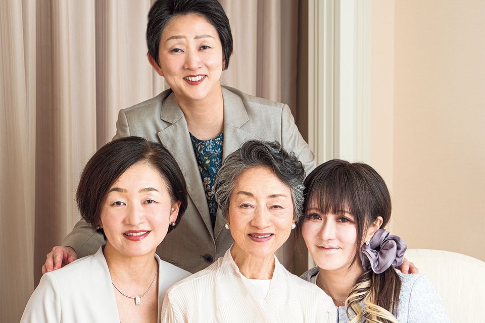 吉川英治文化賞贈呈式にて母・惠子さんを囲んで三姉妹が勢ぞろい。前列右から長女・馨南子(かなこ)さん、次女・史子さん、後列三女・京子さん。当時少数派だった働く母の背中を見て育ち、子育てをしながらキャリアを高めてきた同志のような3人。多忙でめったに会えないのが悩みですが、集合すればたちまち楽しいおしゃべりに花が咲く仲よしご一家。