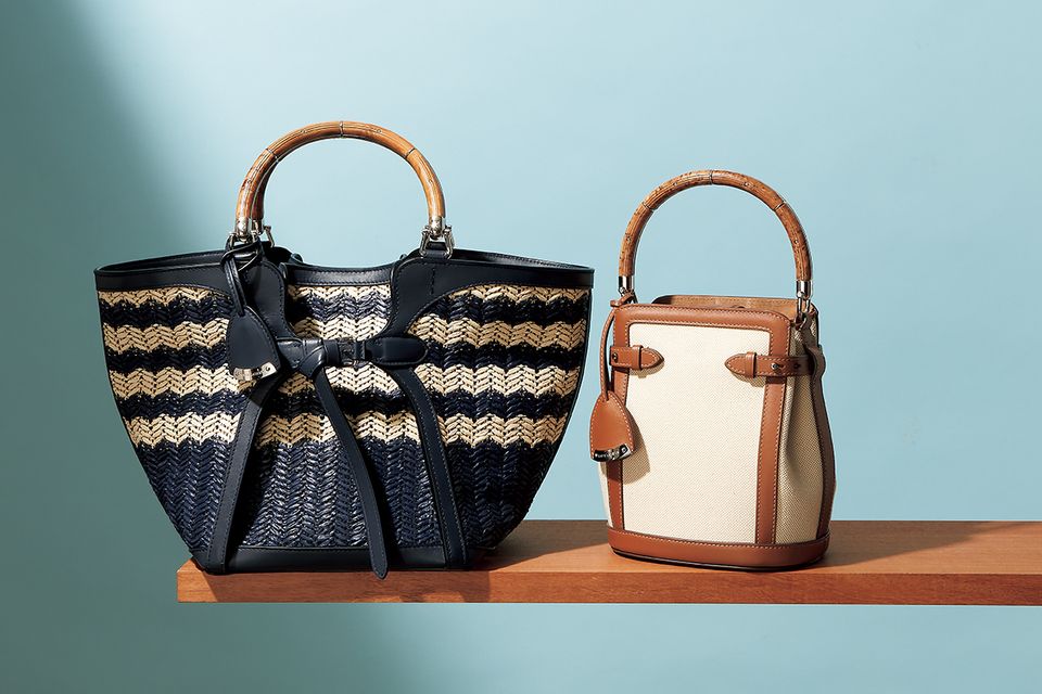 写真右には、ストラップが付属。左はA4の書類も入るサイズでデイリーに大活躍します。右・「The Ralph」バケットバッグ(縦19.5×横16.5×マチ11センチ)40万4800円 左・同トートバッグ(縦24×横40×マチ19.5センチ)63万2500円/ともにラルフローレン