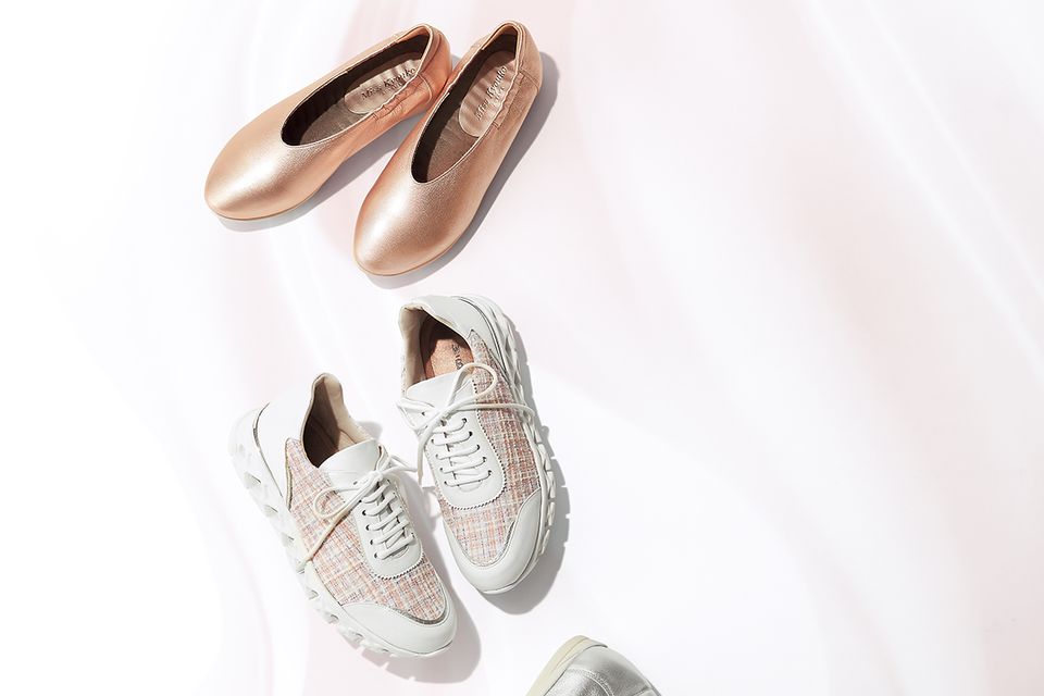 上と下・パンプスは、柔らかいやぎ革を使用しているため、足なじみが抜群。メタリックな色でありながら、派手すぎないので日常づかいに。「4E Vカットフラットパンプス」(ヒール高1.7センチ)各1万9800円 中・アクティブなシーンに活躍する光沢感のあるツイード生地が可愛らしいスニーカー。甲部分は、しなやかな素材のため、足に優しくフィットしてくれます。なだらかな曲線が特徴的なアウトソールは軽量で弾力性も。「W-B-M 4Eレースアップスニーカー」(ピンク、ヒール高3.4センチ)2万4970円/すべてミスキョウコ