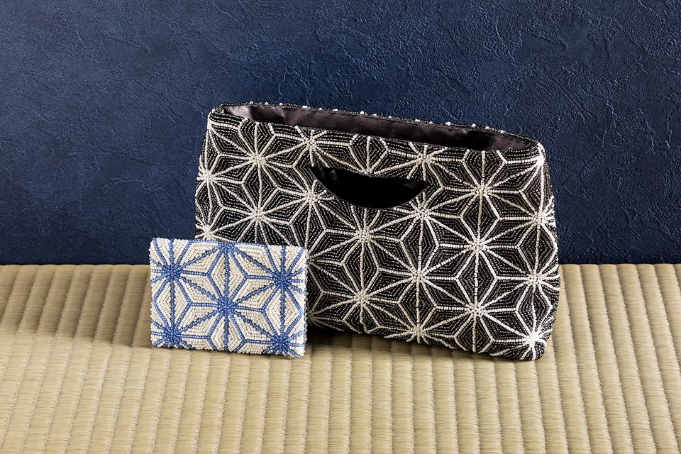 日本に古くから伝わる「麻の葉」柄は、麻の葉を六角形に図案化した魔除けの意味を持つ幾何学模様。これをモダンにあしらった小ぶりなサイズのミニトートです。グレーベースの少しメタリックな煌めきを放つビーズに、アイボリーのラインをシャープに効かせました。