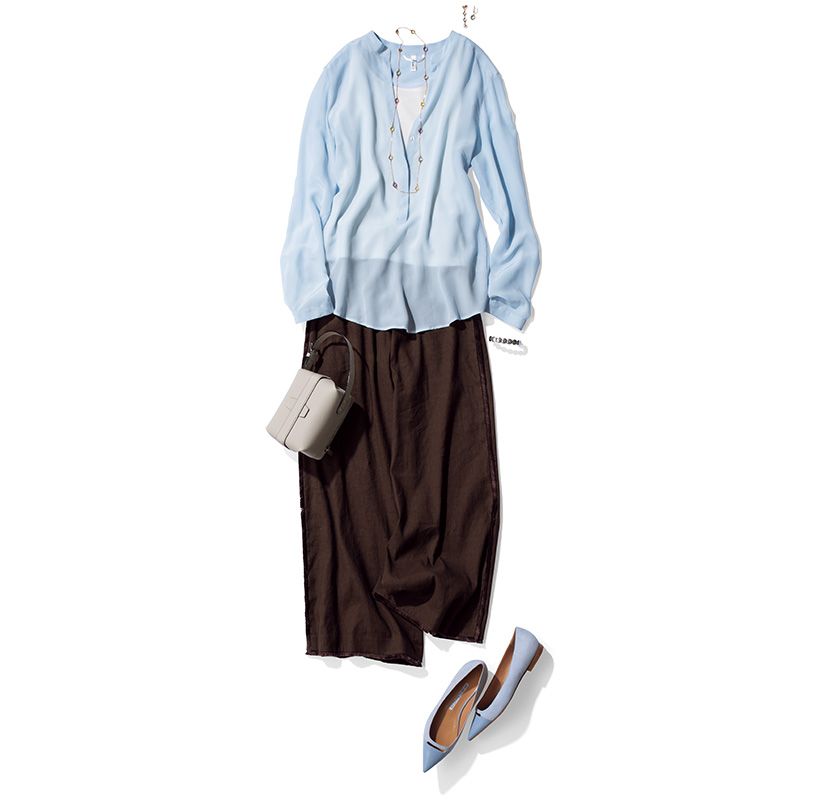 ボリュームのある濃茶パンツは、ペールブルーのブラウスで涼しげにサイドにあしらったフリンジが特徴の、カジュアルなワイドパンツを主役に。ペールブルーで揃えたブラウスとパンプスが、清涼感とともに大人の女性の甘さをプラス。