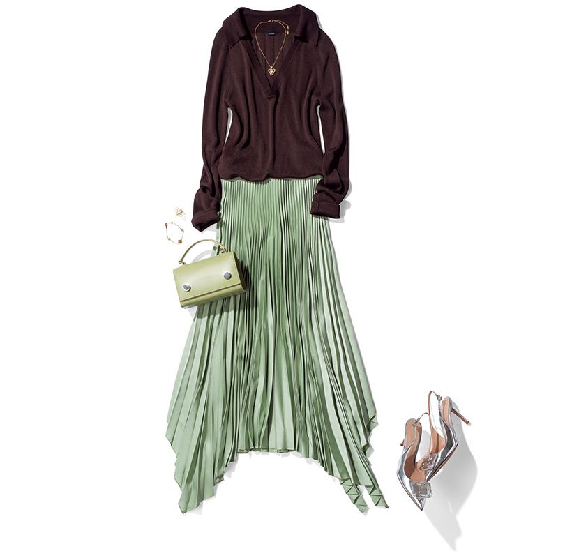 カジュアルブラウンを上品に見せるミントグリーンのプリーツスカート実はどんなカラーとも相性がよい濃茶のトップス。弧を描いたようなカットラインの裾が特徴のミントグリーンのプリーツスカートと合わせることで、辛口フェミニンな印象に。バッグもスカートと同色にすれば装いに統一感が出ます。