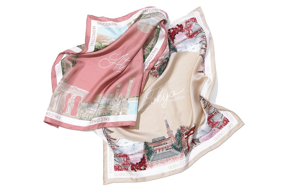 左・ポセイドン神殿などの遺跡をエレガントに落とし込んだ「アテネ」。右・日本のシンボルを集めたシックな「東京」。日本では銀座店のみで販売。スカーフ(縦70×横70センチ)各2万4640円/ともにファルコネーリ