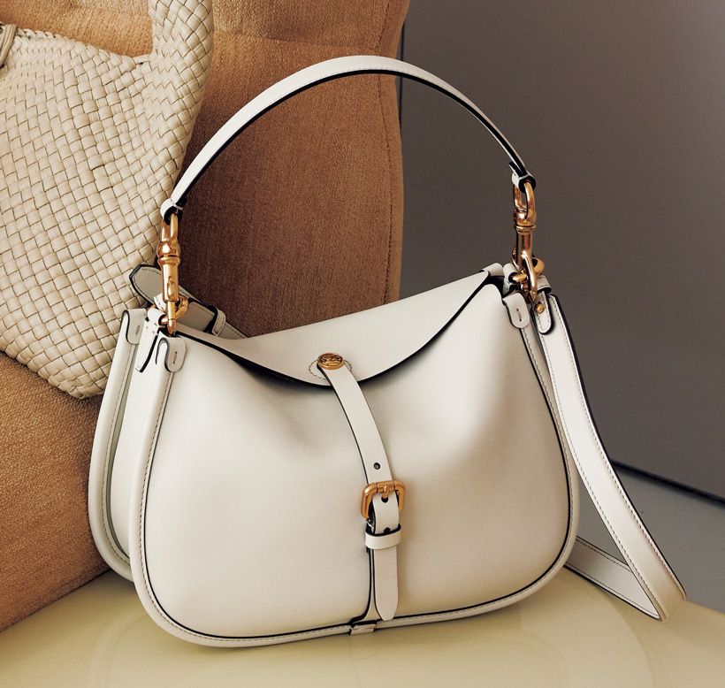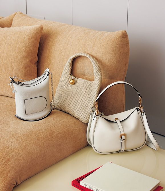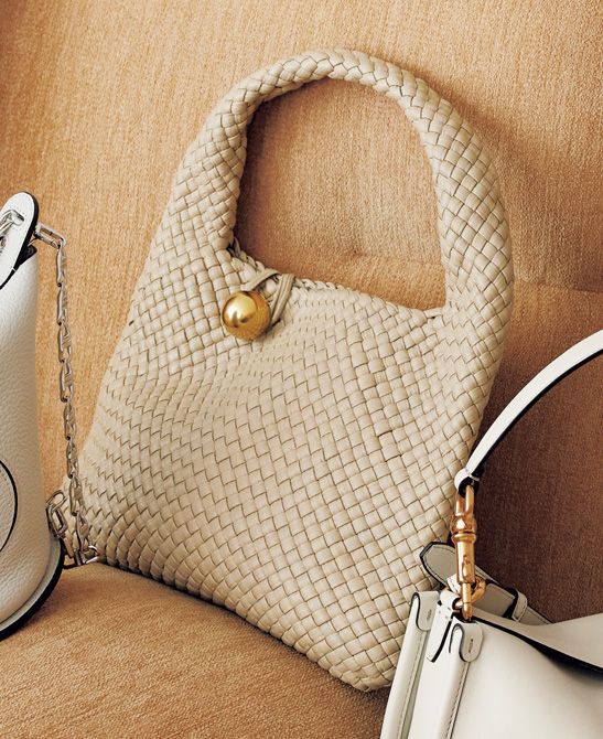しなやかなデザイン美に職人の手仕事が光るテープ状に裁断した約90メートルものナッパレザーを、職人が丁寧に編み上げたホーボーバッグ。オフホワイトにゴールドのメタルボールで、エレガンスを引き立てて。「トスカ」(縦21×横33×マチ7センチ)181万5000円/ボッテガ・ヴェネタ(ボッテガ・ヴェネタジャパン)