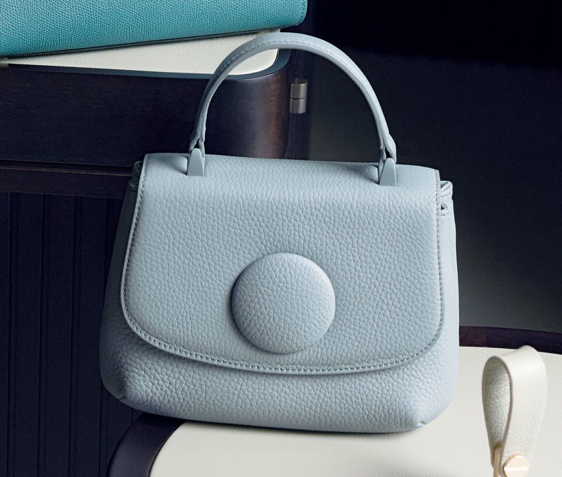 幅広いシーンと装いになじむシックな色彩をまとう柔らかな“和”の心地よさと明るく前進する“光”をデザインに落とし込んだシグネチャーバッグ。夏のビタミンカラーから一転、くすんだサックスブルーで落ち着いた雰囲気と洒落感を演出して。2025年9月上旬発売予定。「MANACOハンドバッグ」(縦17×横22×マチ8センチ)14万8500円/和光