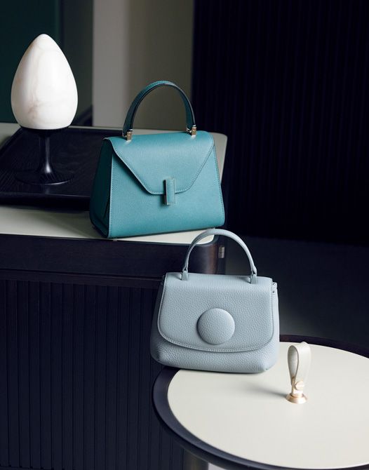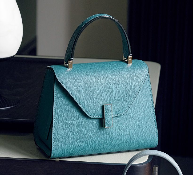 直線的なフォルムと絶妙カラーにときめいてピラミッド型のアイコンバッグ「イジィデ」からボトルグリーンカラーがお目見え。細かなシボが特徴の“ミレプンテカーフスキン”で優しい印象に。「ミニ イジィデ」(縦16×横22×マチ12センチ)59万4000円/ヴァレクストラ(ヴァレクストラ ジャパン)