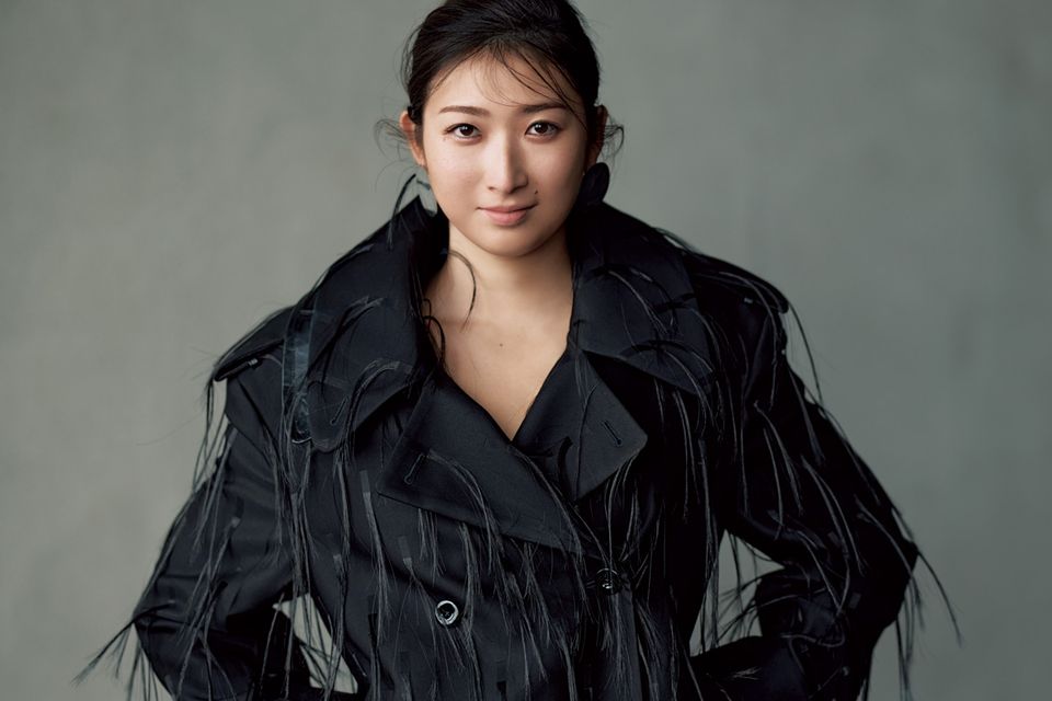 コート全体に施された羽根のような糸の装飾が独創性と遊び心を感じさせます。ポケットに両手を入れ、カメラを見つめる池江さんはスパイ映画の主人公のよう。172センチという高身長で鍛え抜かれたボディを持つアスリートのかっこよさが際立ちます。