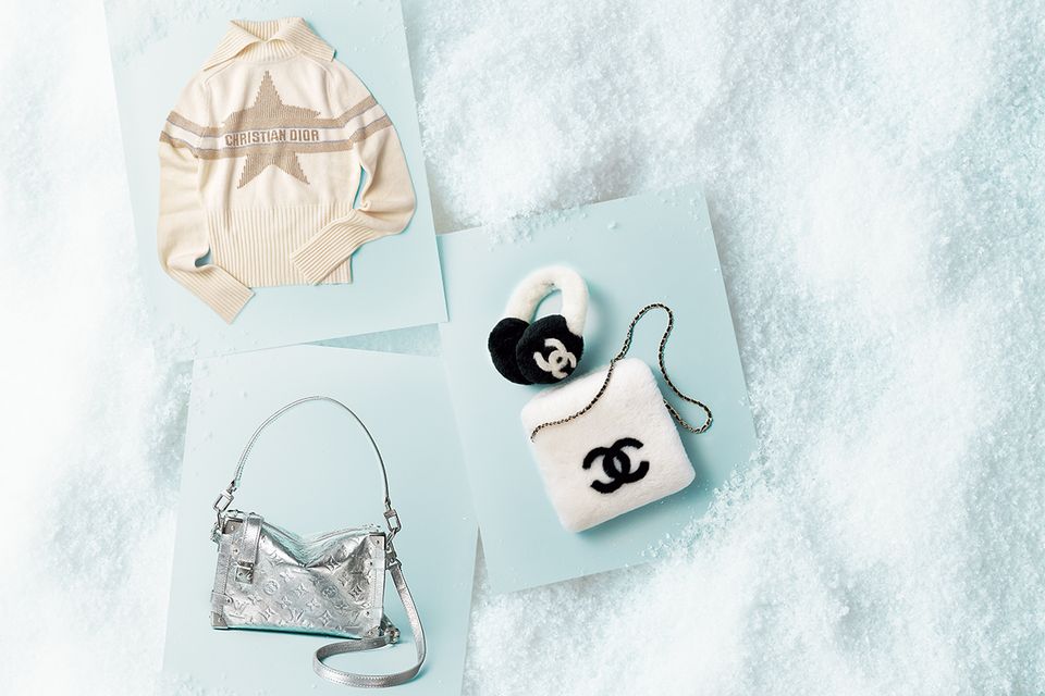 上から時計回りに・ゴールドのメタル繊維であしらわれた「ディオール スター」とロゴが象徴的なタイトなシルエット。ニット33万円/ディオール(問)クリスチャン ディオール フリーダイヤル:0120-02-1947 メゾンのコードカラーであるブラックとホワイトを基調としたシアリング素材のアイテム。イヤーマフ17万3800円 マフ26万1800円/ともにシャネル(問)シャネル カスタマー ケア センター フリーダイヤル:0120-525-519 “モノグラム”をシルバーカラーのレザーに落とし込んだ素材が存在感を放ちます。バッグ「サイドトランク MM」(縦16×横23.5×マチ8.5センチ、シルバー)67万6500円/ルイ・ヴィトン(問)ルイ・ヴィトン クライアントサービス フリーダイヤル:0120-00-1854