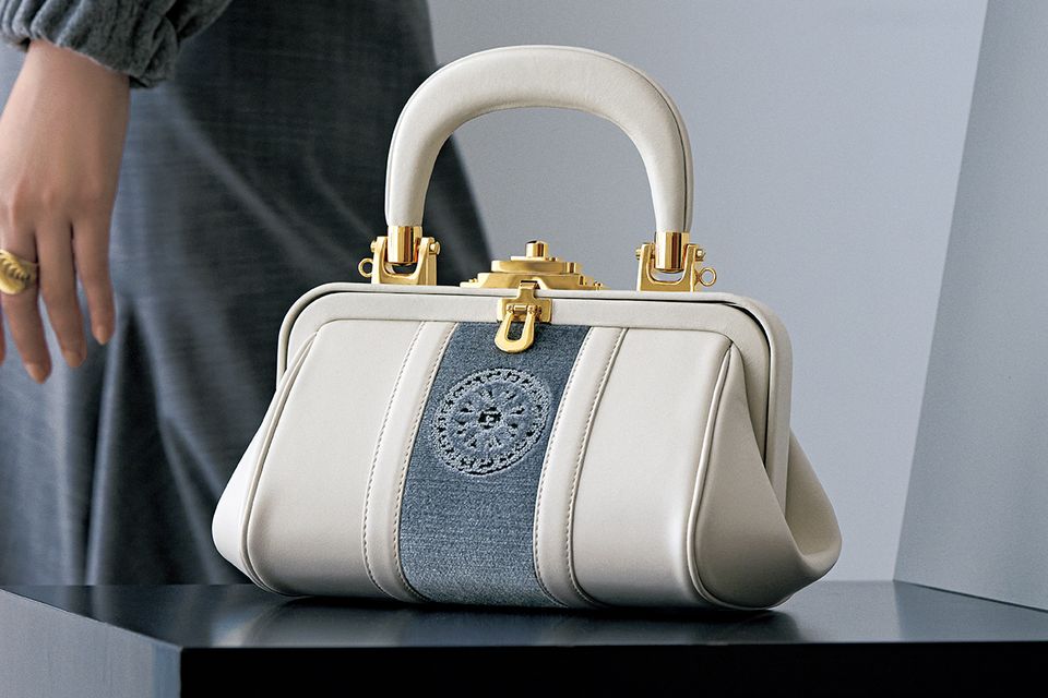 オールマイティに活躍するシックなコンビネーション ノーブルなホワイトレザーに、幸福の象徴である日時計のマークが施されたライトグレーのベルベットを配したデザイン。別注で特筆すべきは、白でもなじみやすいオフホワイトを選び、ロゴチャームを外してシンプルに進化させたところ。合わせる服の色を選ばず、季節を問わない点も特徴です。またモダンなミニサイズなので、デイリーのカジュアルスタイルやきものなど、幅広いシーンで活躍します。バッグ33万880円/ロベルタ ディ カメリーノ ジャケット26万4000円 スカート17万6000円/ともにファビアナ フィリッピ(コロネット)