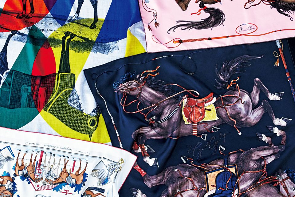 右上・飛び跳ねる馬の生き生きとしたタッチが魅力的。カレ 90「グラン・ギャロップ」(シルクツイル、縦90×横90センチ)8万8000円 右下・立体的に配されたスパンコールやビーズ刺繡が煌めくアーティスティックな一枚。カレ 90 プレシュー「グラン・ギャロップ」(シルクツイル、縦90×横90センチ)61万3800円 左上・乗馬の世界をグラフィカルなタッチで表現。メンズ用のカレH 100「シンメトリー・エケストル」(カシミアシルク、縦100×横100センチ)16万6100円 左下・乗馬を取り巻く優雅な世界の物語を描いて。カレ 70「エレガントな馬装品」(シルクツイル、縦70×横70センチ)6万4900円/すべてエルメス(エルメスジャポン) この記事の掲載号