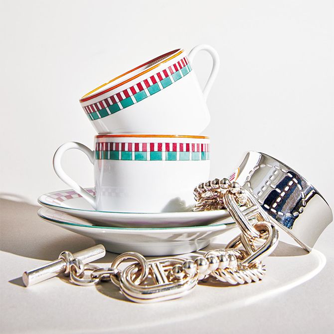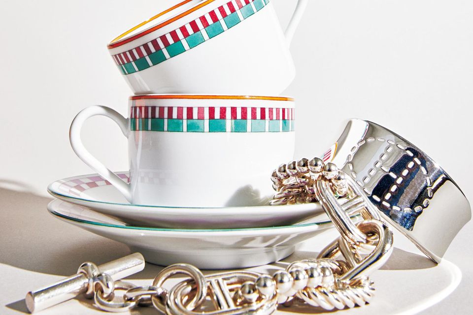 右から・サドルステッチが特徴的な、メゾンの馬具工房へのオマージュとして誕生したコレクション。Hモチーフがスターリングシルバーにパーフォレーションされた象徴的なデザイン。ブレスレット「 ポワン・セリエ」(SV)48万2900円 船の鎖から着想を得たメゾンの名作ジュエリーを再解釈した新ライン。溝入り、ツイスト、ビーズ状などの加工が印象的。ブレスレット「シェーヌ・ダンクル・アレアⅡ」(SV)84万5900円 優しげな色合いが美しい、水彩画タッチの幾何学模様がモダンなテーブルウェア。ティーカップ&ソーサー「エルメス・アン・コントルポワン」4万2900円/すべてエルメス(エルメスジャポン) この記事の掲載号