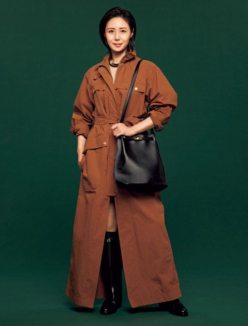 背中にハーネスをあしらったロング丈のトレンチコート。染色と仕上げの工程で洗い加工のようなニュアンスを出し、こなれ感を演出しています。「程よい張り感とエルメスらしい美しいブラウンが素敵です。そして、このバッグもとてもシンプルで美しく、実際に使ってみたくなりました」。トレンチコート78万1000円 バッグ「ケリー・ホーボー」(縦33×横26×マチ11.5センチ)160万6000円 ブーツ47万5200円(参考色) ネックレス26万6200円(参考色)/すべてエルメス(エルメスジャポン)