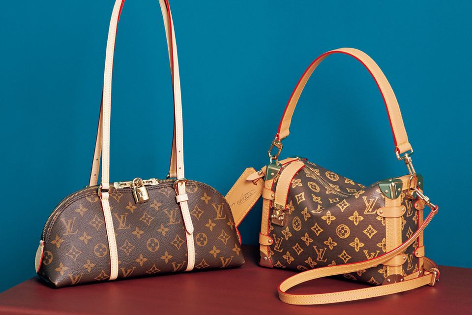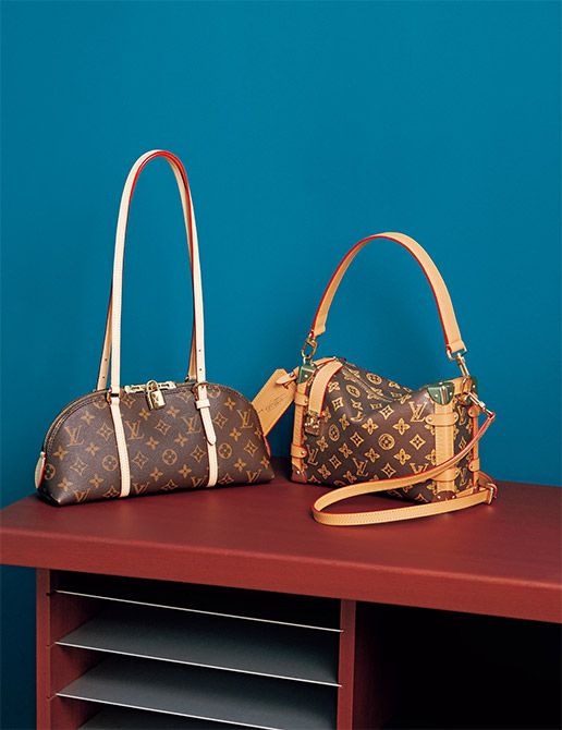 右・1896年に誕生した最初のパターンを、最新のモノグラム・キャンバスで再解釈。ヴィンテージライクなタッチとアイコニックなSロックスタイルの留め金など、印象的なディテールが目を引きます。「サイドトランク MM」( 縦16× 横23.5× マチ8.5 センチ)65万4500円 左・1934年に登場した「アルマ」の原型に着想を得たデザイン。横長で細く長いストラップが特徴的。「スクワイア EW」(縦14×横29×マチ8センチ)34万8700円/ともにルイ・ヴィトン(ルイ・ヴィトンクライアントサービス)この記事の掲載号