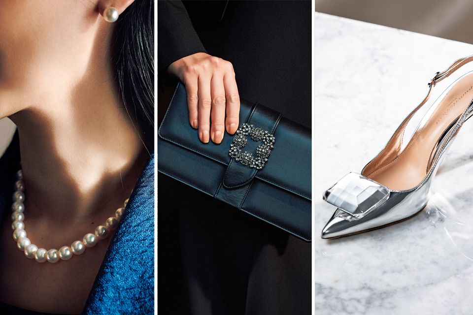 ラインストーンのバックルが煌めくクラッチを、華やかさのアクセントに。バッグ36万800円/マノロ ブラニク(ブルーベル・ジャパン)