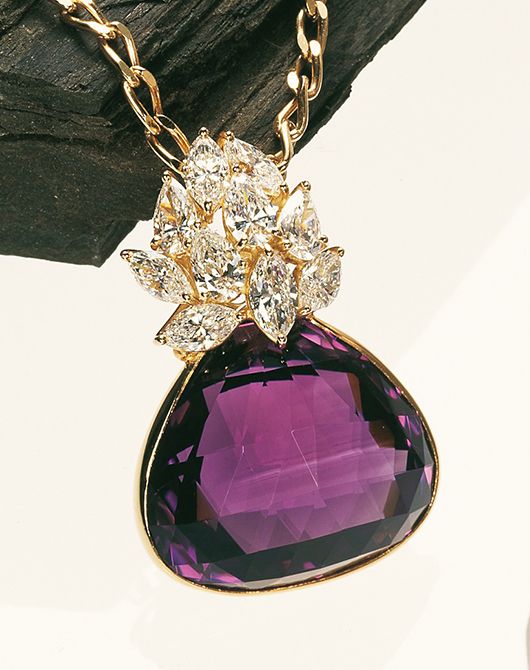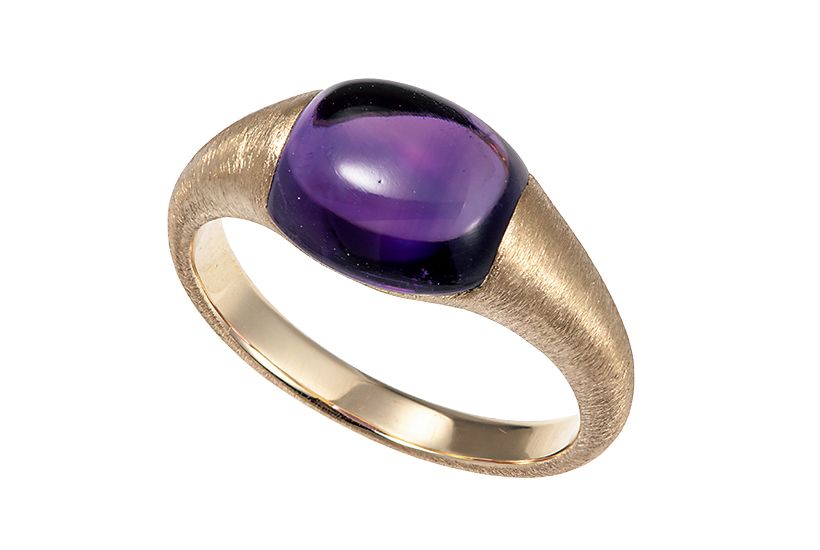 A.紫の深く柔らかな色合いを引き出すカボションカット(上写真)がおすすめです。硬度10のダイヤモンドや硬度9のルビーなどと比べて、硬度7のアメシストは摩耗しやすく、また、ファセットカットにすると角や稜線が欠けやすいといえます。その点、カボションカットなら表面に微細な傷がついても美しさが大きく損なわれることは少なく、長く愛用できます。とはいえ、好みもありますので、物に接触することが少ないネックレスや、特別な日だけにつけるジュエリーであれば、ファセット付き(下写真)のものを選ぶのもよいでしょう。