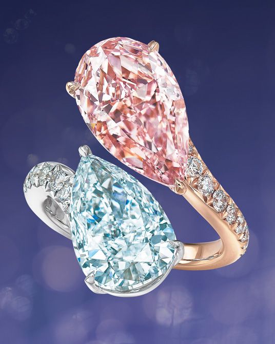 近年価格が特に高騰しているのがピンクダイヤモンドとブルーダイヤモンド。こちらは、クリスティーズオークションで落札されたカラーダイヤモンドのトワエモアリング。(ピンクオレンジダイヤモンド〈5.01ct〉×ブルーグリーンダイヤモンド〈5.01ct〉×ダイヤモンド×ゴールド)。