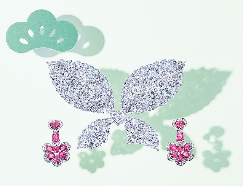 ハートのモチーフに宿る大切な人との想い出かたや幸せのシンボルである蝶をダイヤモンドでかたどり、かたや情熱の意味を持つルビーを花のように施したハイジュエリー。これらの2つの幸運の象徴を彩るのが、「ショパール」がこよなく愛するハートの意匠です。