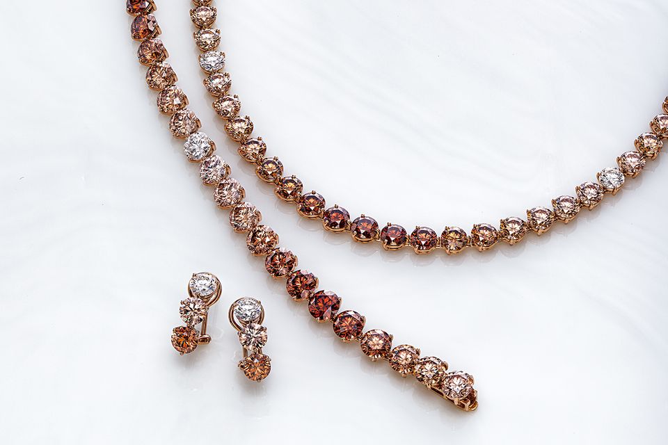 自然が生み出したブラウンの濃淡を生かして、美しいグラデーションを紡いだ特別なピース。最も明るい部分にはカラーレスダイヤモンドを配して、爽やかさをプラス。「ブラウンダイヤモンド」ネックレス(BG×ブラウンダイヤモンド×ダイヤモンド計45.80ct)4400万円 同ブレスレット(BG×ブラウンダイヤモンド×ダイヤモンド計28.33ct)3960万円 同ピアス(BG×ブラウンダイヤモンド×ダイヤモンド各2.1ct×2)495万円/すべてカシケイブラウンダイヤモンド