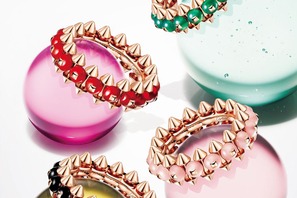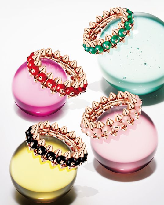 独創的なデザインが人気を集める「クラッシュ ドゥ カルティエ」コレクション。グリーンアゲート、レッドアゲート、ピンクカルセドニー、オニキスといった鮮やかな天然石とのコンビネーションで、その世界観がさらに広がります。これらのストーンビーズをピンクゴールドのピコ(円錐形のスタッズモチーフ)で挟むようにセット。立体的なボリューム感がいっそう際立つ、洗練のフォルムに。「クラッシュ ドゥ カルティエ」リング上から(PG×グリーンアゲート)105万6000円 (PG×レッドアゲート)105万6000円 (PG×ピンクカルセドニー)105万6000円 (PG×オニキス)91万3000円/すべてカルティエ(カルティエ カスタマー サービスセンター)この記事の掲載号
