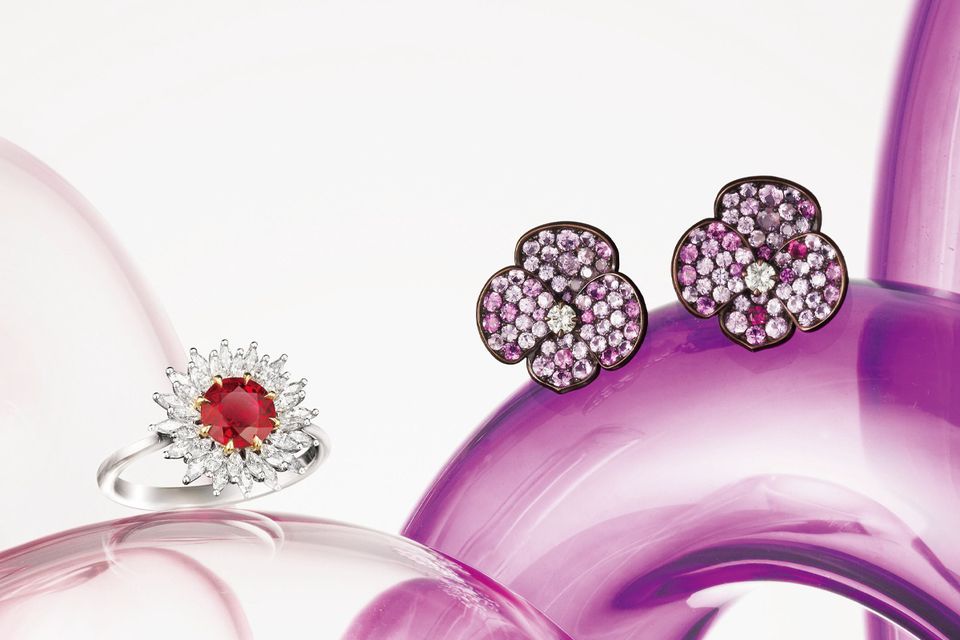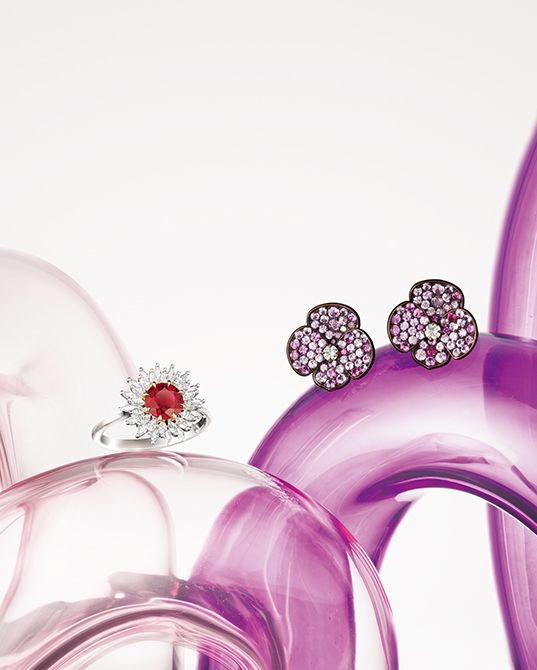 1.31カラットのラウンドブリリアントカットのルビーを中心に、マーキスカットのダイヤモンドで花びらの一枚一枚を表現したリング。濃淡が異なるサファイアをパヴェセッティングし、ふくよかなニュアンスを帯びた花のピアスとともに、ショパールのクラフツマンシップが発揮されています。赤系の宝石は情熱や生命力を高めてくれるともいわれ、さまざまなシーンで身に着ける人のお守りとなってくれるはず。リング(WG×YG×ルビー×ダイヤモンド)486万2000円 ピアス(WG×サファイア×ダイヤモンド)420万2000円/ともにショパール(ショパール ジャパン プレス)この記事の掲載号