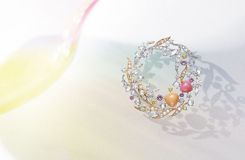 希少なコンクパールの福々しい色と形を主役に、ダイヤモンドとサファイアで春風をまとう植物をイメージしたブローチ。イエローゴールドとホワイトゴールドの葉をミックスし、奥行きのある佇まいを叶えています。ブローチは直径5センチほどで、ジャケットに着けたときにちょうどよい大きさです。幸福感に満ちた逸品は、慶事はもちろん日々のお洒落に活躍。ブローチ(WG×YG×コンクパール×サファイア×ダイヤモンド)1100万円/ミキモトこの記事の掲載号
