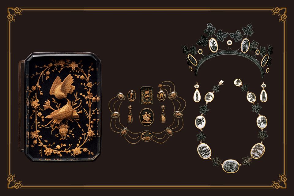 2つ目は、木を彫った実に珍しいカメオです。黒い台座はおそらく真珠母貝を黒く染めたもので、その上に驚くほど精緻に、柘植(つげ)か果樹の木と思われる硬い木を彫ったデザインが載っています。デザインのテーマは母子像や花束、恋愛の象徴であるハエなど古典的なモチーフで、ジュエリーは6点、カメオの数は合計13点のパリュールです。今回はその中から鳩をご覧ください。一つ扱いを間違えると折れかねない木を、どうすればここまで繊細に彫れるのか。これはイタリアのトリノなどで活躍したボンザニーゴという天才彫刻師が彫った作品で、ナポレオン妃ジョゼフィーヌの注文であったといわれていますが、確証はありません。ともかく、これほどに繊細なものが、壊れもせず残っており、それが日本にはるばる来たというのも、感慨深いものがあります。