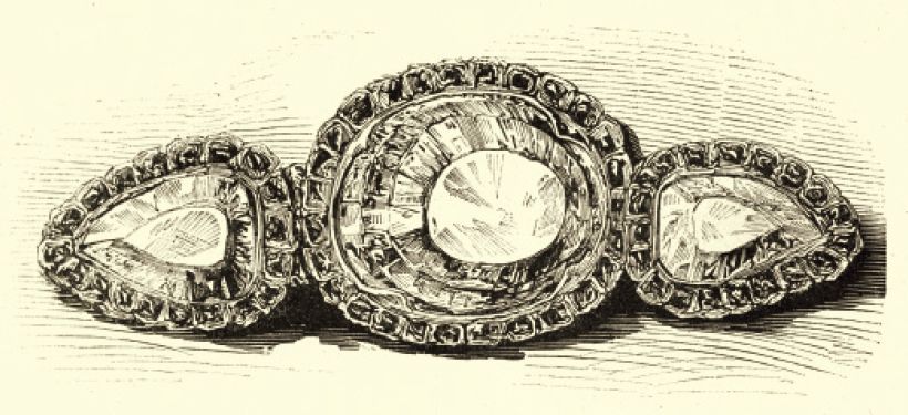当初、インドでのこの宝石は、他の2つのダイヤモンドと一緒にセットされ、「バズ」と呼ばれる上膊(じょうはく)部につけるブレスレット(1)だったのですが、ロンドン万国博に際しては、台座から取り外して裸にして、光線が当たってよく光るように……と展示されました。ところが、会場では光線が当たる時間が1日に数時間しかなく、さっぱり光らないので、これを見にきた大衆からは大不評だったそうです。