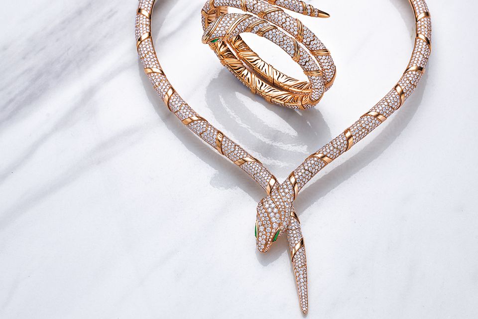 神秘性を感じさせる魅惑的なモチーフ1948年に初のコレクションを発表以来、ブルガリを象徴するモチーフとして存在感を放つ「セルペンティ」。強さと自信を表すそのデザインは、巳年である今年、ぜひ手に入れたいジュエリーの一つ。「セルペンティ」ネックレス(PG×エメラルド×ダイヤモンド) ブレスレット(PG×エメラルド×ダイヤモンド)ともに参考商品/ブルガリ