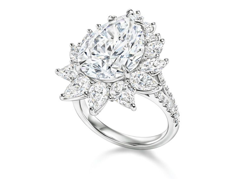 Dカラー、インターナリーフローレスのダイヤモンドをフィーチャーした「レガシー・コレクション」より。センター約6.22ctの存在感溢れるペアシェイプダイヤモンドが輝くリング(Pt×ダイヤモンド)