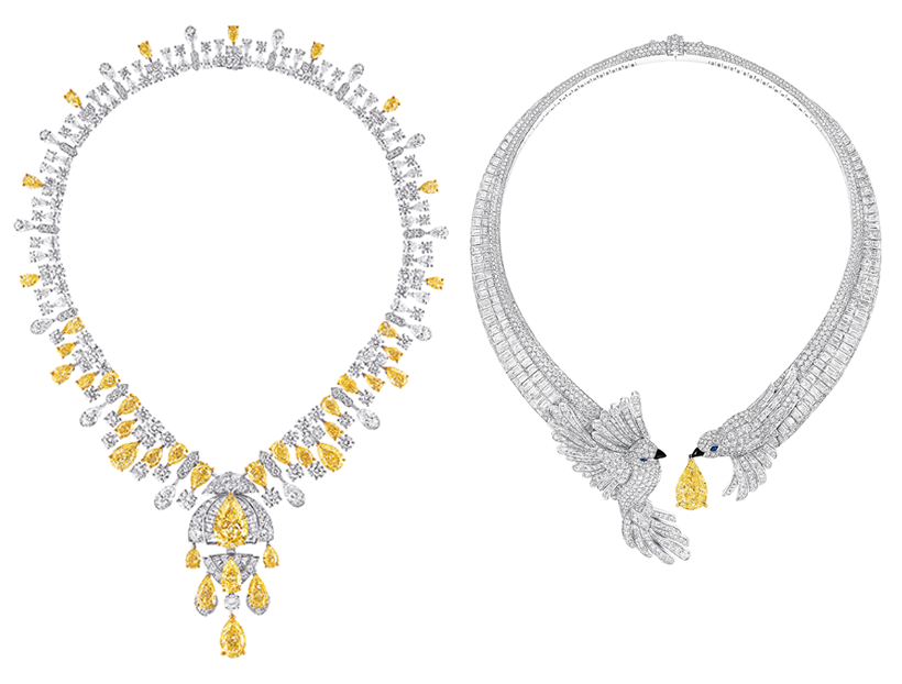 左・「トライバル」ネックレス(WG×YG×ファンシーイエローダイヤモンド×ダイヤモンド)参考商品/グラフ(グラフダイヤモンズジャパン)右・3.13.51ctのファンシーインテンスイエローダイヤモンドが輝いて。「ギフト オブ ラブ」ネックレス(WG×YG×ファンシーイエローダイヤモンド×ダイヤモンド×サファイア×オニキス)参考商品/グラフ(グラフダイヤモンズジャパン)