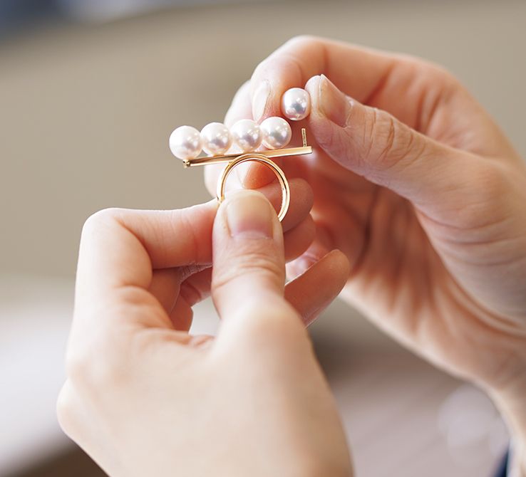 ひと粒ひと粒の表情がほんのわずかに異なるアコヤ真珠。どの向きで真珠を留めるか、職人の経験が必要とされます。