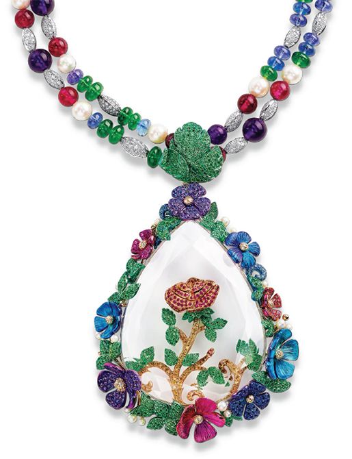 ネックレス(WG×RG×チタン×ロッククリスタル×タンザナイト×ピンクサファイア×パステルブルーサファイア×ブラウン-コニャックダイヤモンド×ブラウンダイヤモンド×サファイア×アメシスト×ツァボライト×真珠×ルベライト×ダイヤモンド)8328万6000円(参考価格)/ショパール(ショパール ジャパン プレス)