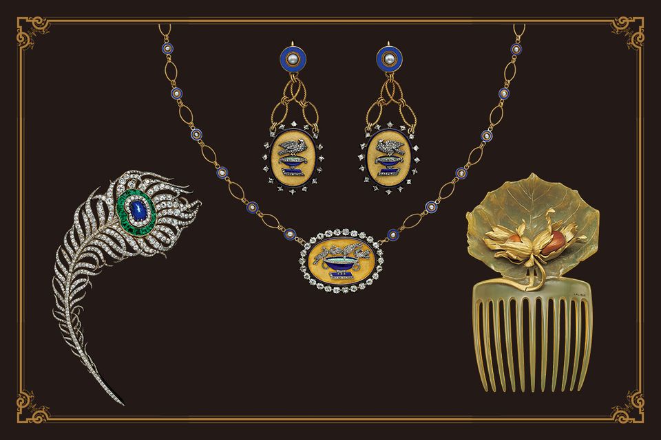 ブローチ/エイグレット“孔雀の羽根”孔雀は古来より権力、栄光、富、不死などの象徴であり、インドの国鳥でもある。19世紀後期から20世紀初期にかけて、ジュエラーたちの大きな着想源となった。フレデリック・ブシュロン作のエイグレットは、優雅な曲線を描く孔雀の羽根の軽やかさを見事に表現している。
