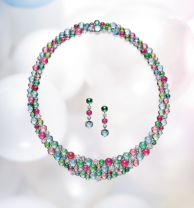 ネックレス(Pt×トルマリン計92.975ct×アクアマリン計40.074ct×ダイヤモンド計11.779ct)4950万円 ピアス(Pt×トルマリン×アクアマリン×ダイヤモンド)275万円/ともにギメル(ギメルトレーディング)