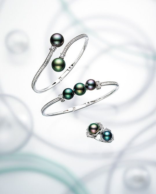 真珠の色の個性と存在感を最大限に生かしてタヒチで採れる黒蝶真珠は、自然に生まれる一粒一粒の色がすべて違います。その特性を生かした「タヒチアンマルチ」のジュエリーは、パールに人工的な加工を一切施さず、一粒一粒そのままの色や形を生かしているのが特徴。新作のブレスレットは、パールの球体としての美しさや存在感を際立たせるため、シャープでエレガントな曲線にさりげなくダイヤモンドを添えて。色の個性を生かし、隣り合う色が引き立て合うようにパールを配置することで、ほかにはない個性と品格を発揮します。