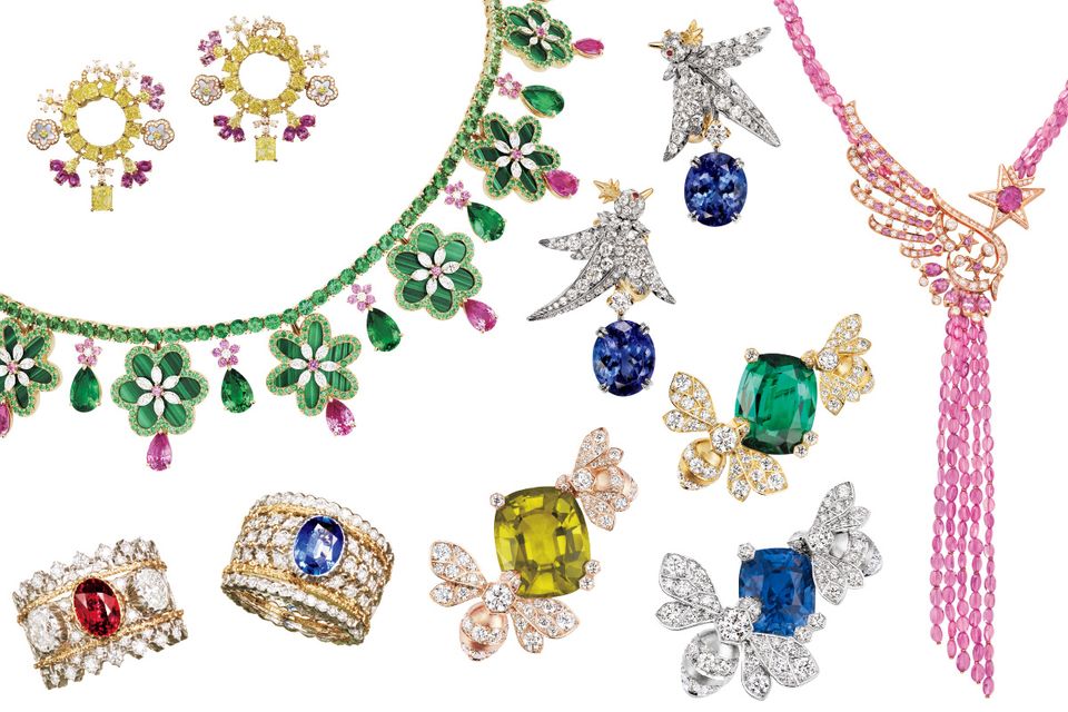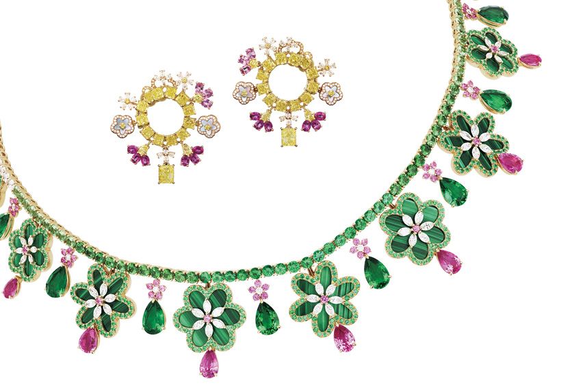 「ディオレクスキ」より、イヤリング(YG×ホワイト&イエローダイヤモンド×ピンクサファイア×マザーオブパール×ダイヤモンド)1億1000万円 ネックレス(YG×ダイヤモンド×エメラルド×ピンクサファイア×ツァボライト×マラカイト)2億2200万円(ともに参考価格)/ともにディオール ファインジュエリー(クリスチャン ディオール フリーダイヤル 0120-02-1947)