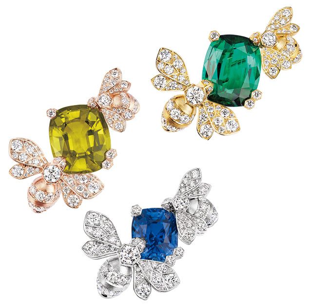 〈上から〉「ジュエルズ バイ ネイチャー」ビー ブローチ(YG×PG×グリーントルマリン×ダイヤモンド)〈参考商品〉 (PG×イエローグリーントルマリン×ダイヤモンド)〈参考商品〉 (WG×サファイア〈スリランカ産〉×ダイヤモンド)7447万円(参考価格)/すべてショーメ (ショーメ TEL 03-5635-7057)